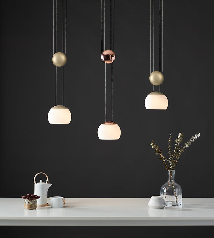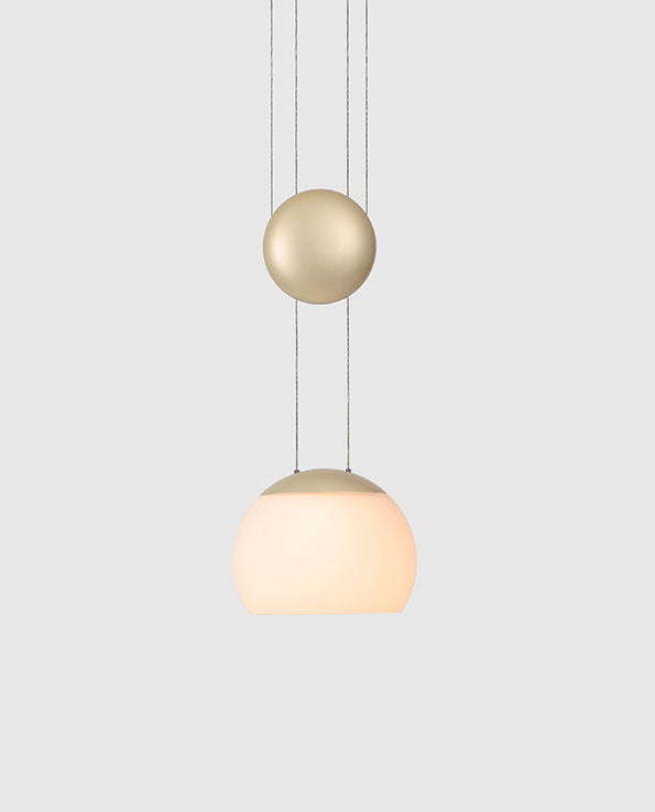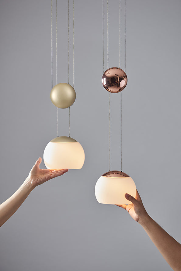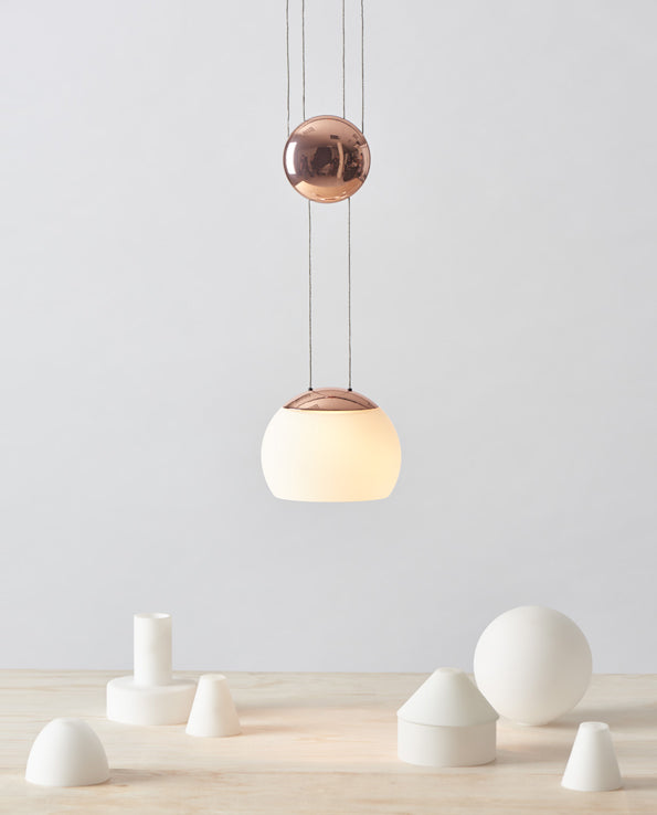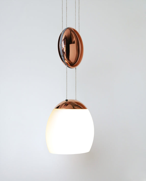 With and adjustable height shade inspired by the movement of a Yo-Yo, the JoJo pendant is a traditional shape with modern sensibilities. Lit with an LED bulb, the JoJo casts a gentle, calm illumination through the mouth-blown opal shade.