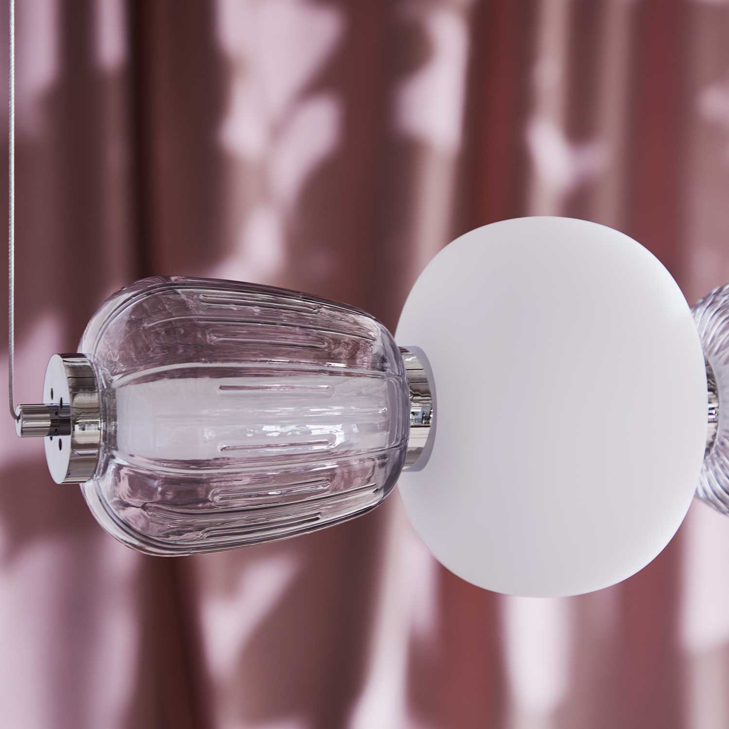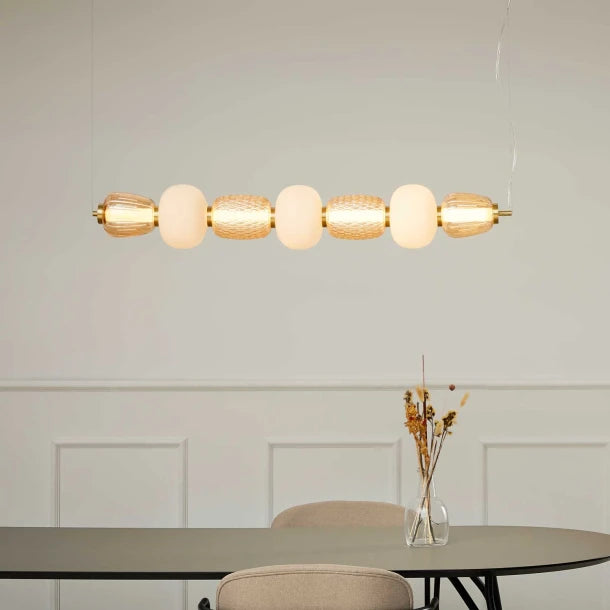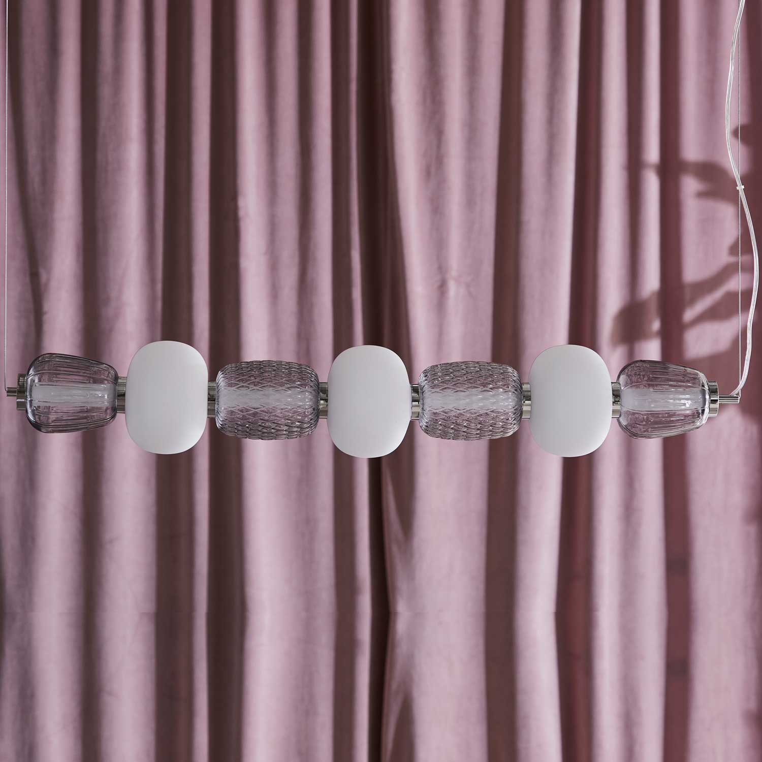 TEKSTLIKE BEADS ON A STRING, THE LAMP PRESENTS ITSELF DECORATIVE, EXCLUSIVE AND CLASSIC AT THE SAME TIME. PEARL IS WITH BUILT-IN LED, SUSPENSION IN CHROME OR MATTE GOLD, THE GLASSES ARE HAND-BLOWN.